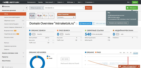 Ограниченным функционалом можно воспользоваться бесплатно. Для получения доступа к более глубокой аналитике предложат выбрать платную опцию. Русскоязычная версия не обнаружена.