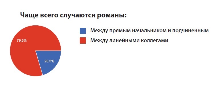 Итоги исследования показали, что служебные романы на работе, где мы проводим большую часть нашего времени, конечно, случаются – почти 80% опрошенных ответили, что были свидетелями таких романов. Особенно часто это происходит между линейными сотрудниками, когда не мешают статус и положение (79,5%).