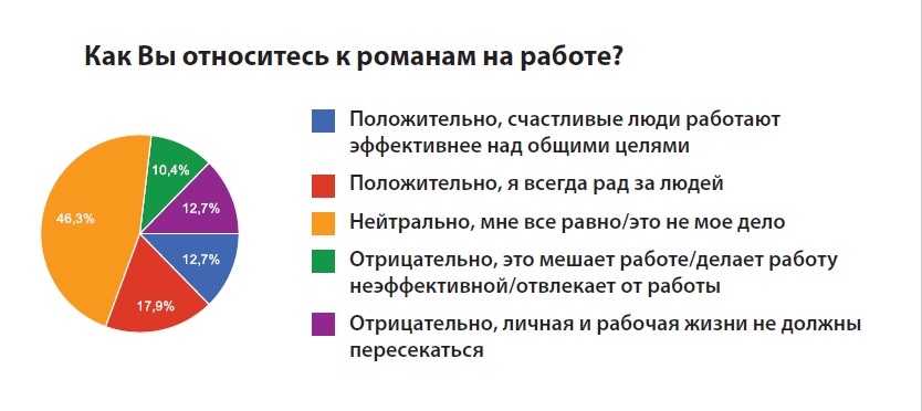 Вопреки бытующему мнению о том, что отношения в коллективах часто негативно воспринимаются окружающими, результаты показывают обратное. Люди не считают нужным вникать в личную жизнь своих коллег – более 46% опрошенных нейтрально относятся к любовным отношениям на работе.