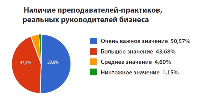 Ключевую роль при выборе бизнес-школы играет наличие преподавателей-практиков, реальных руководителей бизнеса. Этот параметр отметили почти 95% опрошенных.